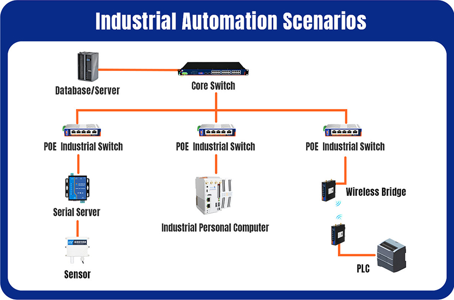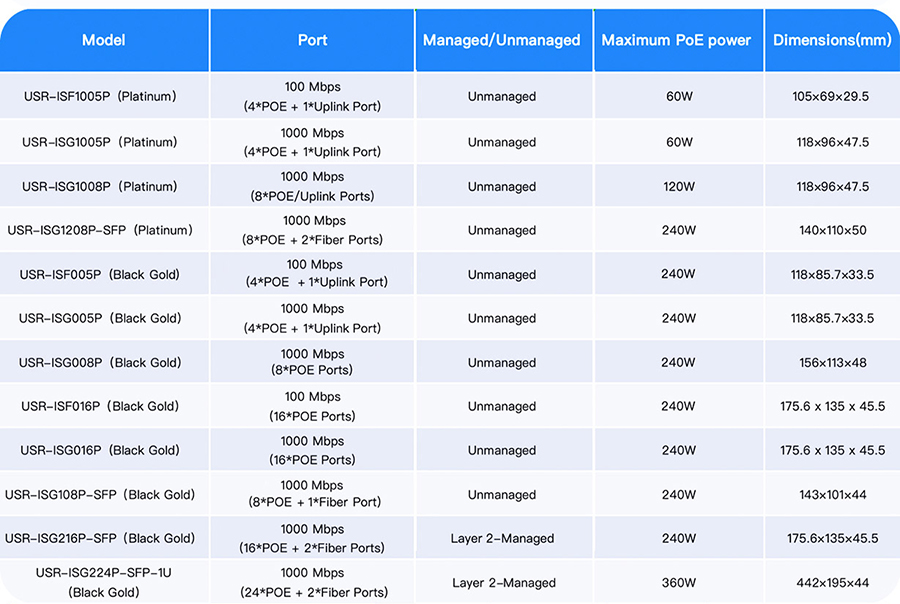 |48V PoE Industrial Switch Special for security weak current, power supply and networking in harsh environments The industrial POE switch series integrates data transmission and power supply functions, supporting IEEE 802.3af/at standards with up to 30W per port. It offers flexible port configurations (5/8/16/24 ports) in both managed and unmanaged types. Managed models enable advanced network management like VLAN partitioning and QoS policies, while unmanaged ones feature plug-and-play simplicity. Widely used in security monitoring and industrial scenarios, these switches reduce cabling costs and enhance network deployment flexibility.