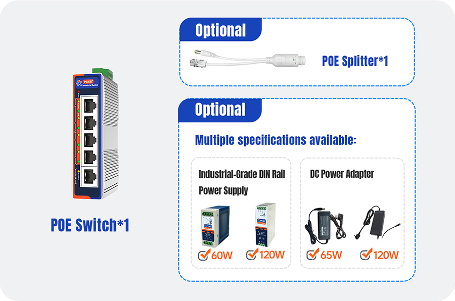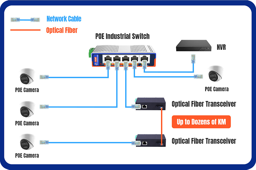 POE Switches are equipped with fiber optic uplink ports (such as SFP ports), which can extend the data transmission distance to tens of kilometers via optical fibers, meeting the requirements of medium and long-distance wired monitoring networking.