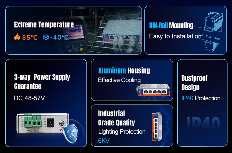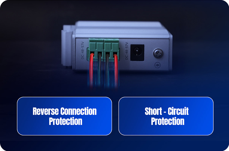 - 3-way power supply guarantee (DC48 - 57V): DC interface for plug-and-play; dual power terminal redundant power supply.