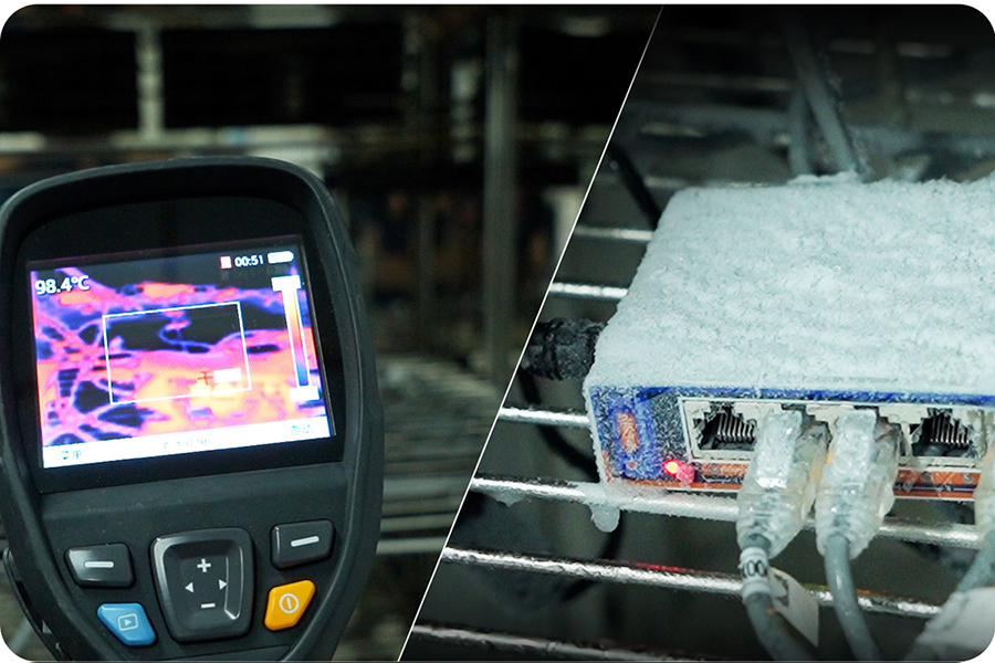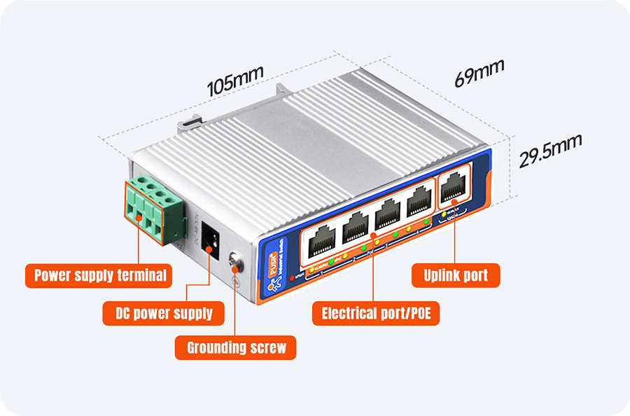With a metal shell, it is compact and easy to install. It is equipped with a DC power supply interface, power supply terminals and a grounding screw. The electrical/PoE ports can supply power and transmit data via network cables, and the UpLink port is used for high-speed network interconnection.