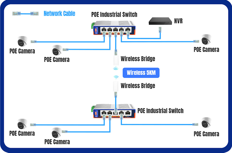 Break through the limitations of wired transmission distance and wiring conditions. There is no need to deploy a separate power supply for each bridge. It enables network intercommunication between PoE industrial switches in two areas and connected devices such as PoE cameras, meeting the security monitoring needs in environments with long distances and difficult wiring.