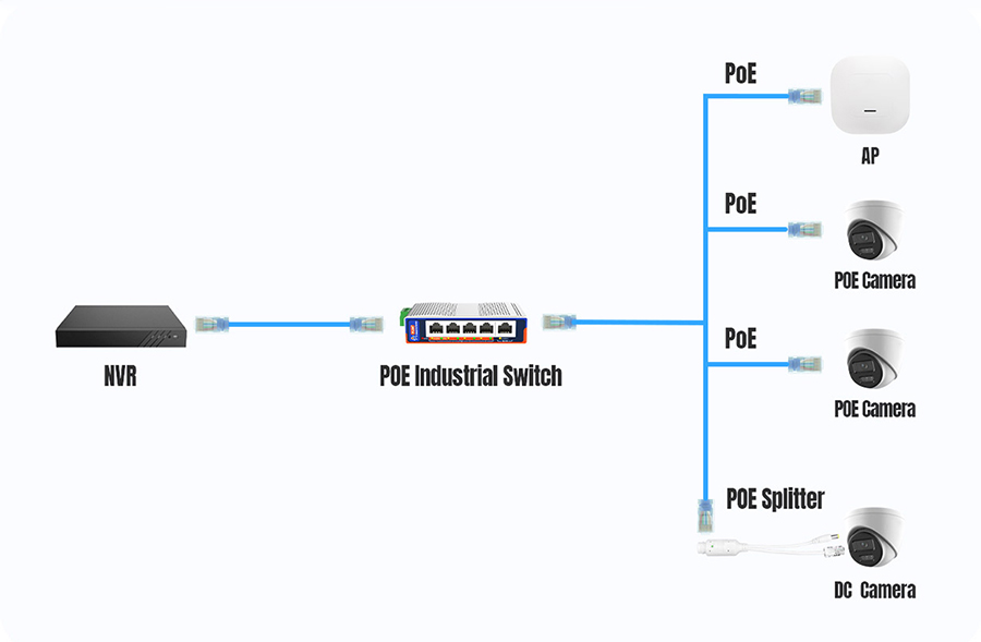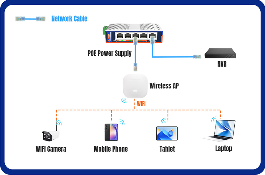 POE Switches power APs, eliminating the need to lay separate power cables for APs. This allows APs to be more flexibly deployed in areas requiring WiFi signal coverage, facilitating the connection of WiFi cameras and expanding the monitoring range.