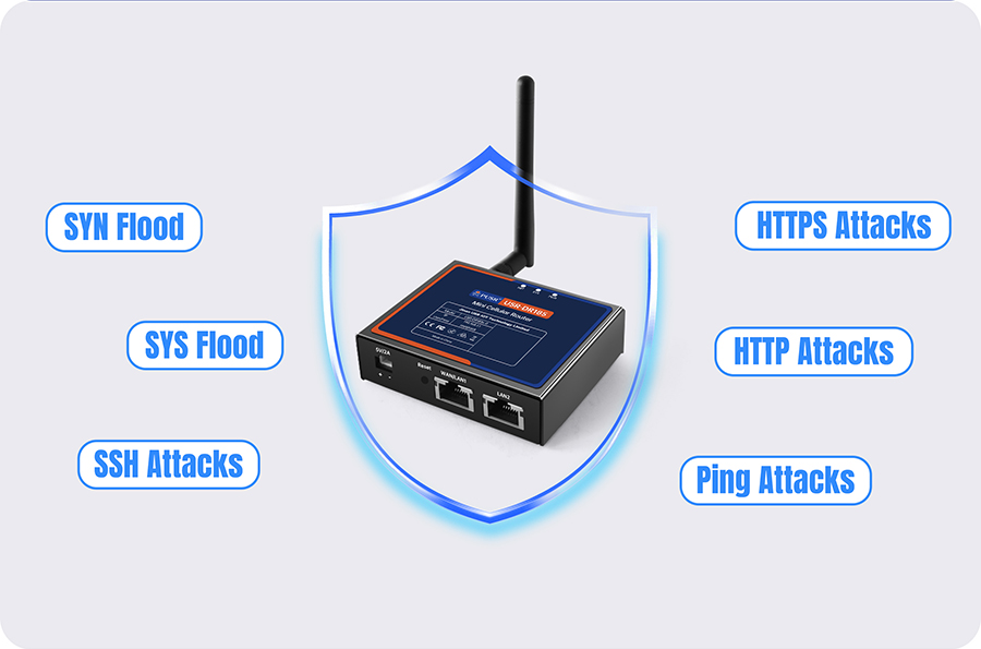 Network Attacks The USR-DR185s-G features a built-in, meticulously optimized firewall system, allowing users to add corresponding policies based on their applications. The device also includes protection against SYN flooding, SSH attacks, and ping attacks.